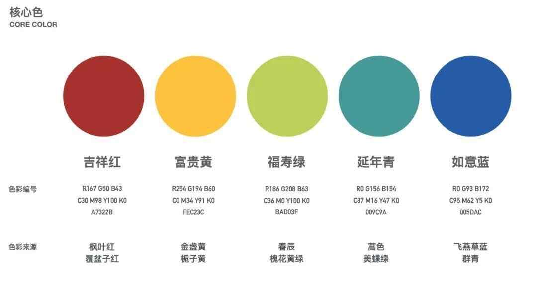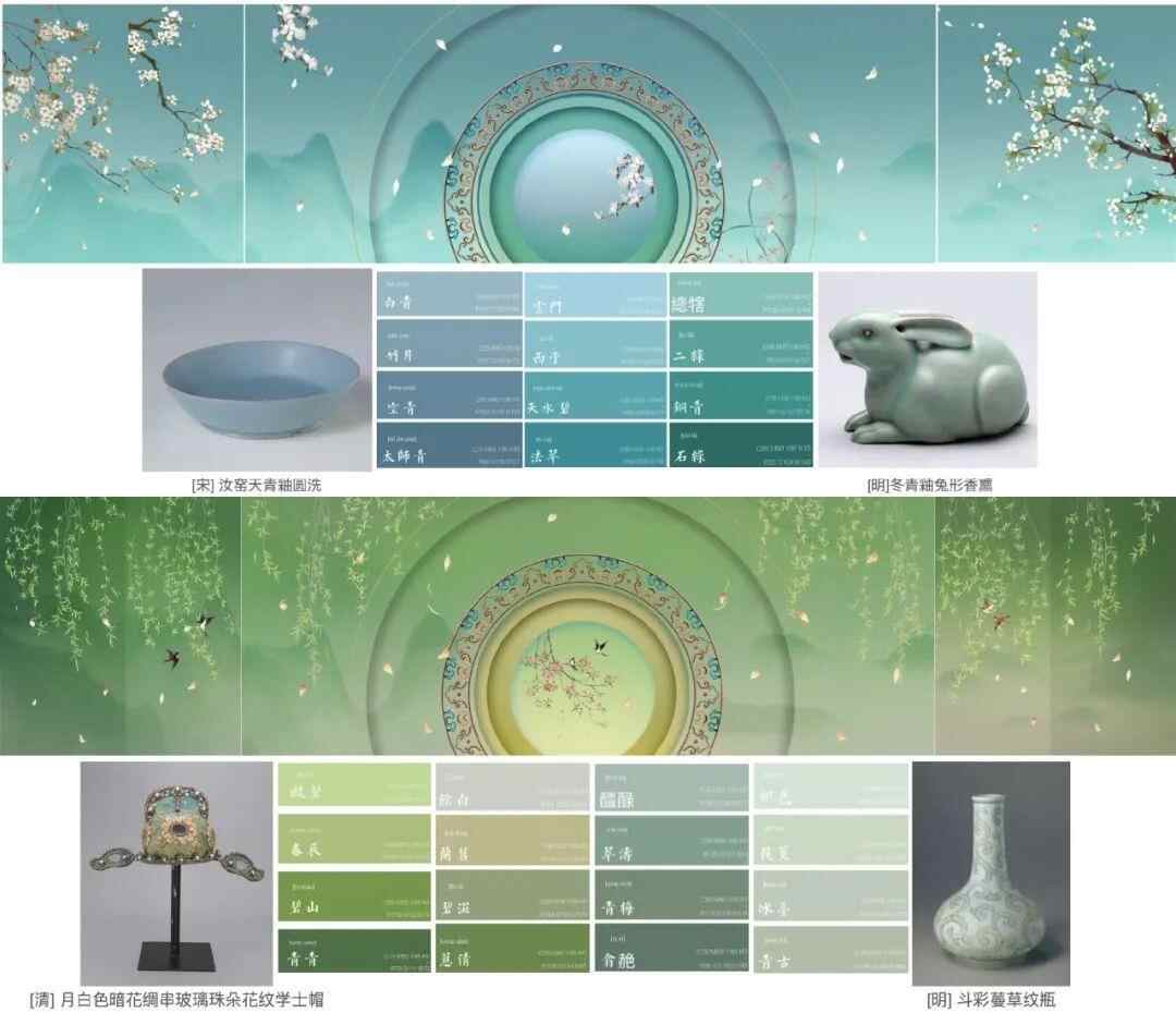 蓝色番中以白玉兰、白梅花和兰花等主要视觉元素象征高洁和典雅,寓意“玉堂富贵”。绿色番视觉则以简洁单纯的柳枝和海棠寓意“春暖花开”。