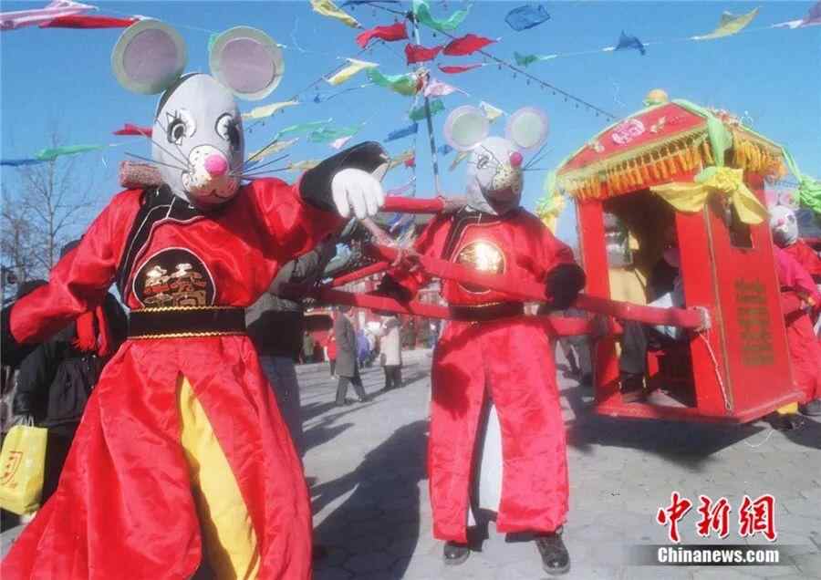 1996年2月,北京龙潭庙会上,“鼠”轿夫抬着娶亲的轿子鼓乐齐鸣,引得逛庙会的中外游客争着上轿当回“鼠新娘”。王瑶 摄