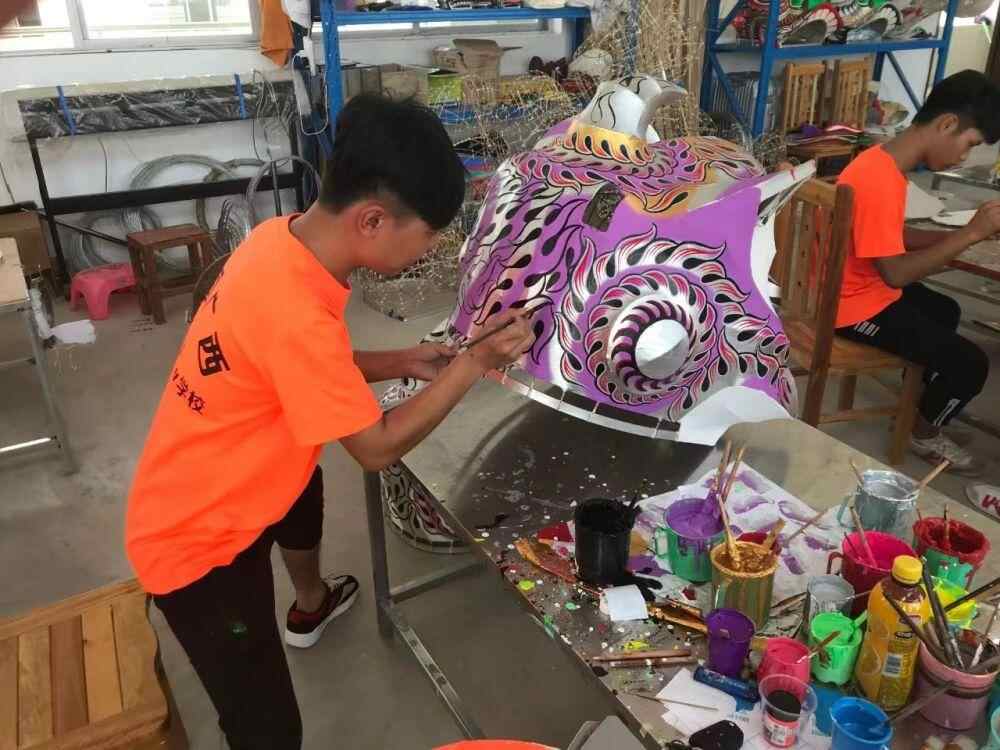 走进占地1000多平方米的扎作艺术馆,首先映入眼帘的是一个巨型的狮头扎作品,雄狮惟妙惟肖,神气十足。平日里,学生们就是在这里制作出一套套精美的狮头狮袍和文创产品。