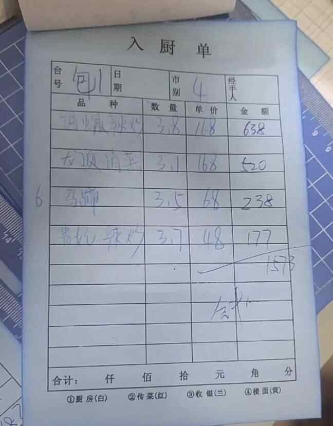 4个海鲜菜品共1573元,加上米饭、纸巾金额14元,实际消费共计1587元,店家实收1500元。