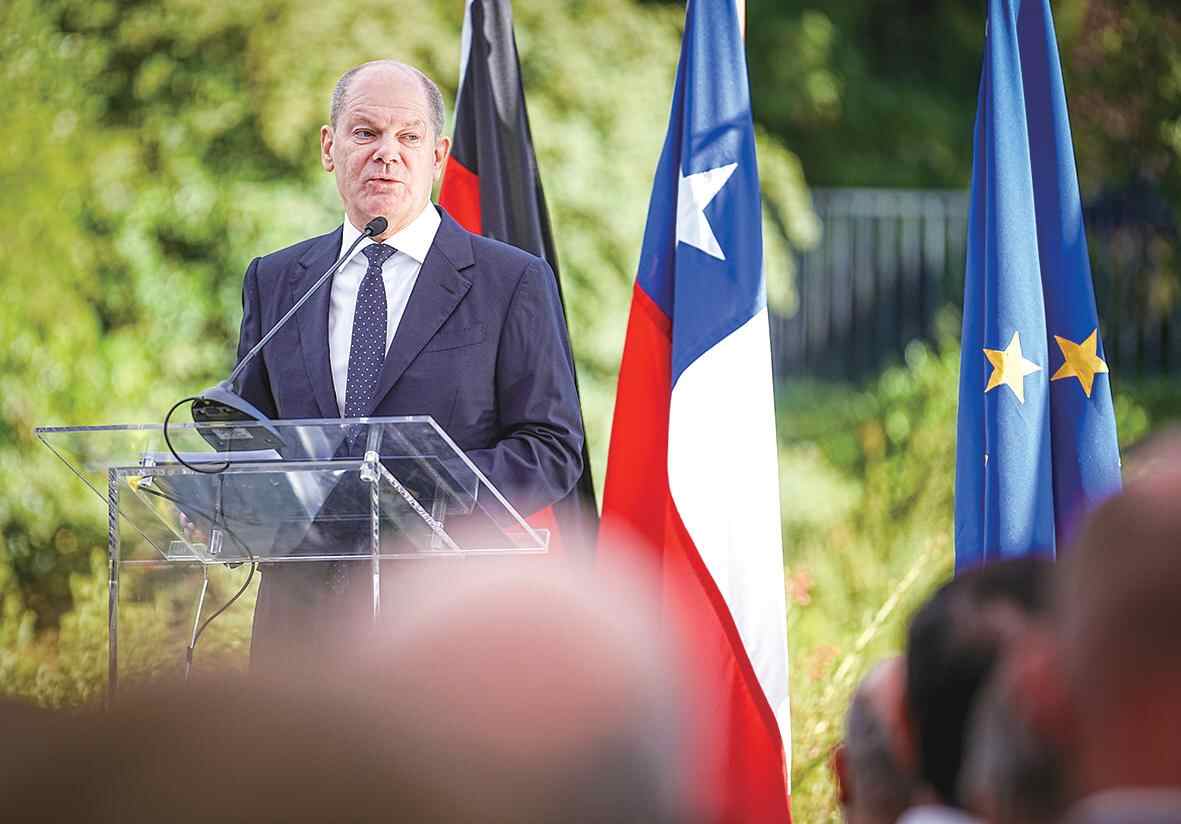 朔尔茨28 日开启南美行,首站阿根廷表示不愿军援乌克兰。图为他30 日在智利发表演讲。(视觉中国)
