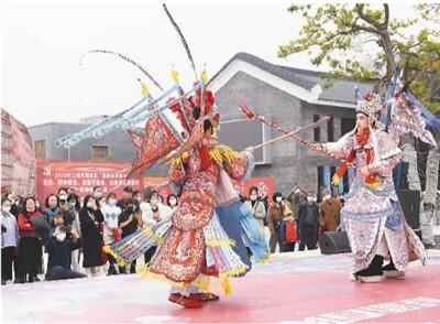 循声而去,在高德三街广场的舞台上,身着蟒扎靠、头戴翎子的刀马旦与身着白色剑衣、背插靠旗的武生正在表演激烈的打戏。双方兵器不断碰撞,演员闪转腾挪,围观的市民游客聚精会神观看,不时爆发出阵阵掌声与喝彩。