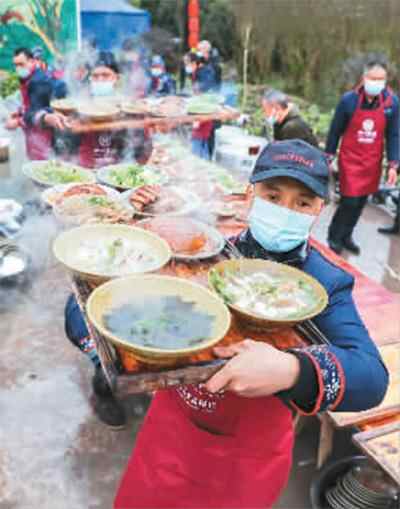 在庆铃镇,服务员正为食客们端上“川南请春酒”特色美食。庄歌尔摄(人民图片)