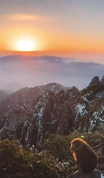 太阳之下,群山、诸峰、白雪、黄山松、短尾猴各现其美,美不胜收。