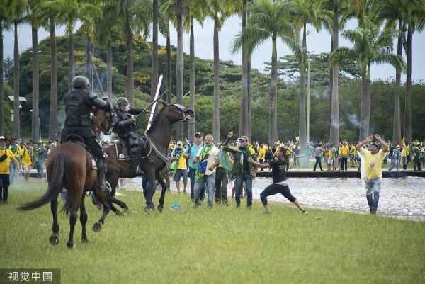 2023年1月8日,巴西巴西利亚,巴西前总统博索纳罗的支持者闯入国会,与骑警发生冲突。(视觉中国)