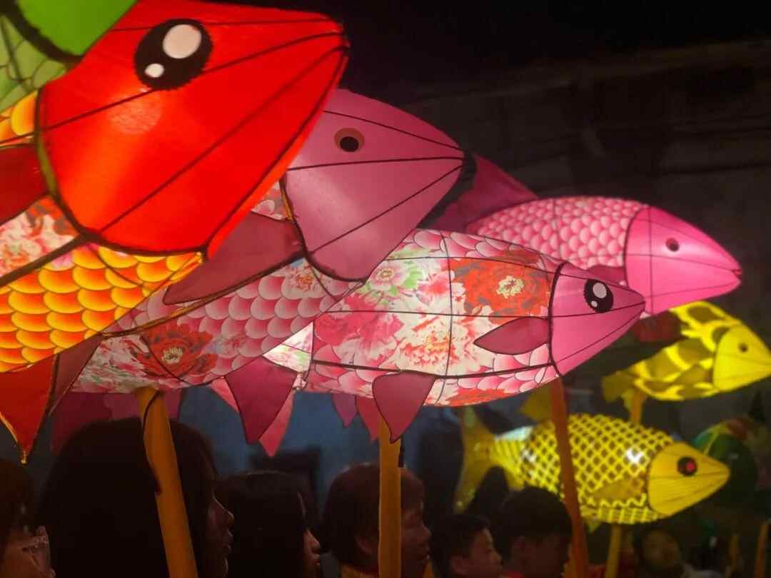 传统的渔灯是用竹编织的,而现在的渔灯是用铁艺和绸布制作,手艺精湛,造型栩栩如生,有凤鸡、虾、鲤鱼、鲢鱼、青鱼、黑鱼等造型,红、青、黄、黑……色彩缤纷。
