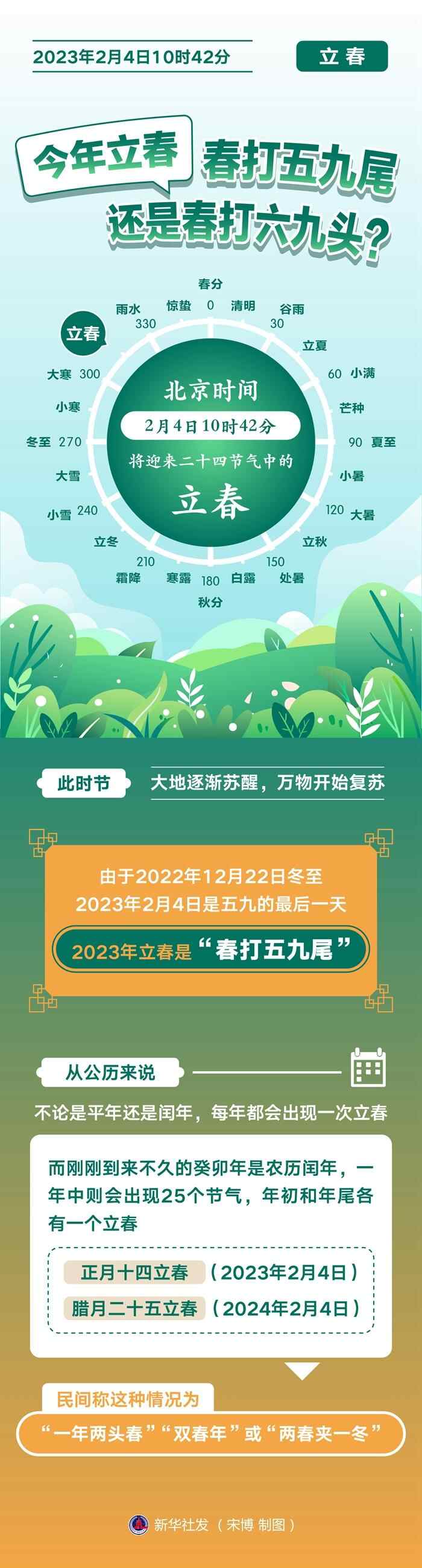今年的立春属于哪一种情况?“我国民间有从冬至这一天开始‘数九’的习俗。2022年12月22日冬至,数一数会发现,2023年2月4日是五九的最后一天,很明显2023年立春是‘春打五九尾’。冬至通常出现在公历每年的12月21日或22日。如果2022年的冬至出现在12月21日,那么,2023年立春就是‘春打六九头’。”中国天文学会会员、天津市天文学会理事杨婧说。