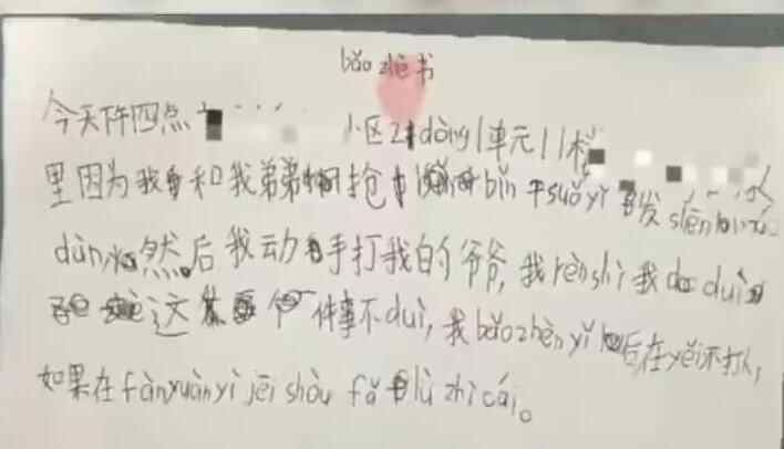近日,武汉江汉,一名8岁男孩因为再一次打了爷爷,被爸爸一怒之下送进派出所自首。民警耐心教育,小男孩认识到自己的错误,写下满是拼音的保证书:我 rèn shì 我这件事不duì,我bǎo zhèn yǐ 后在yěi 不打人……网友:拼音没写对,回家还得继续教育。