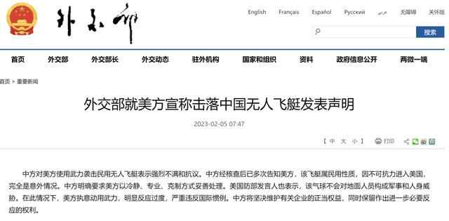 外交部表示,中方对美方使用武力袭击民用无人飞艇表示强烈不满和抗议。中方经核查后已多次告知美方,该飞艇属民用性质,因不可抗力进入美国,完全是意外情况。