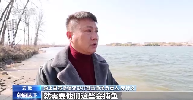 颍上县黄桥镇郭彭村智慧渔场负责人 郭行义:禁捕以来,好多渔民就没有事情做了,我们智慧渔场就需要他们这些会捕鱼,会捞鱼的工人,转化为我们的产业工人,既解决了我们工厂的用工问题,又解决了他们就近就业问题。