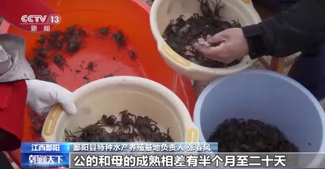 鄱阳县特种水产养殖基地负责人 张春凤:公的和母的成熟相差有半个月至二十天,第一把母的老一点的先上市场,公的还没有成熟的时候就等二十天,半个月以后再上市场。