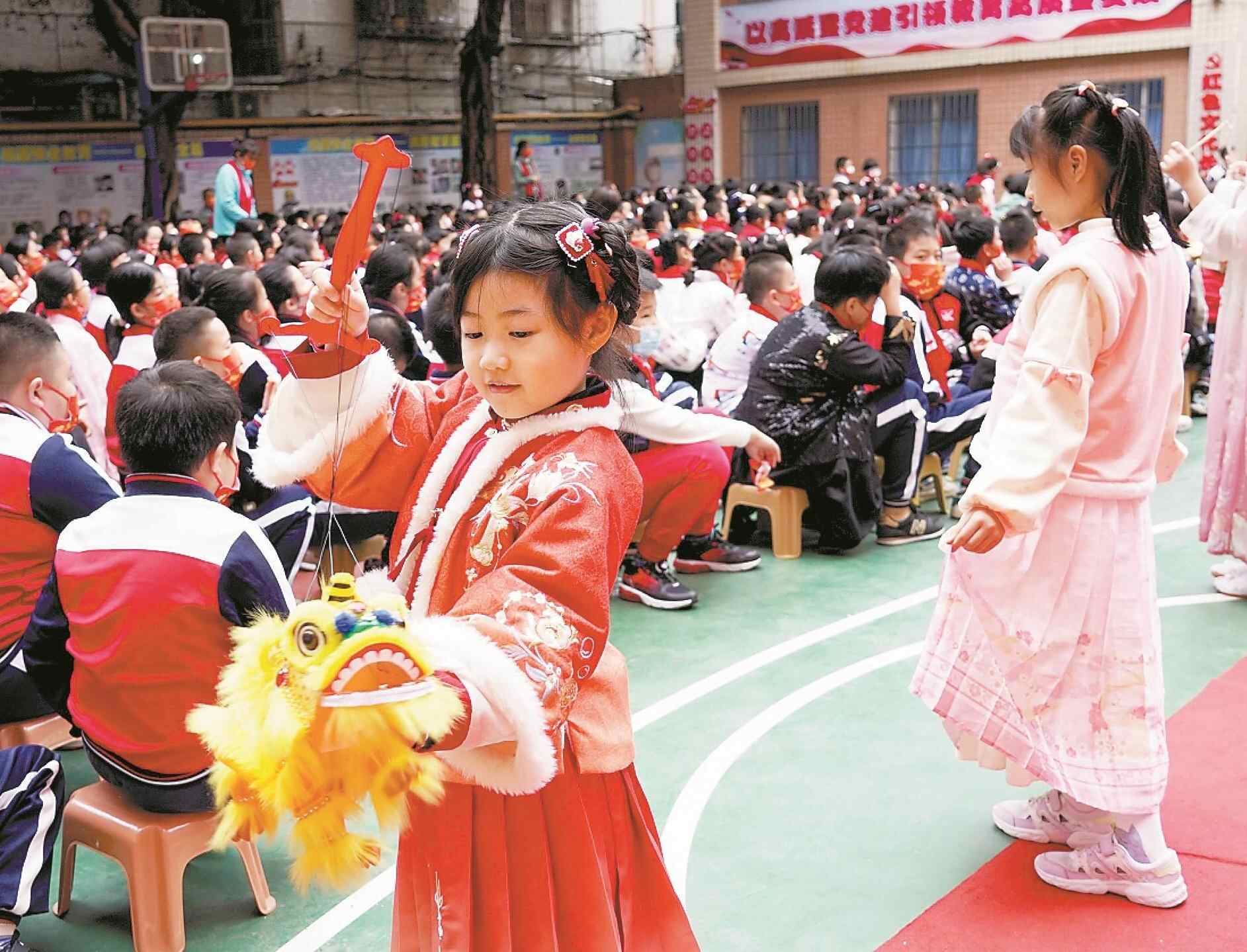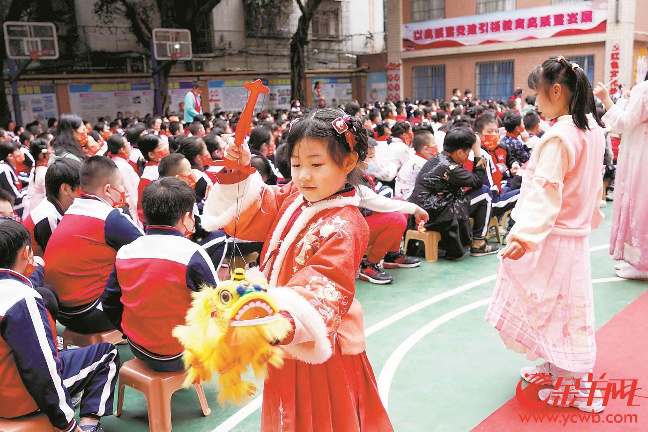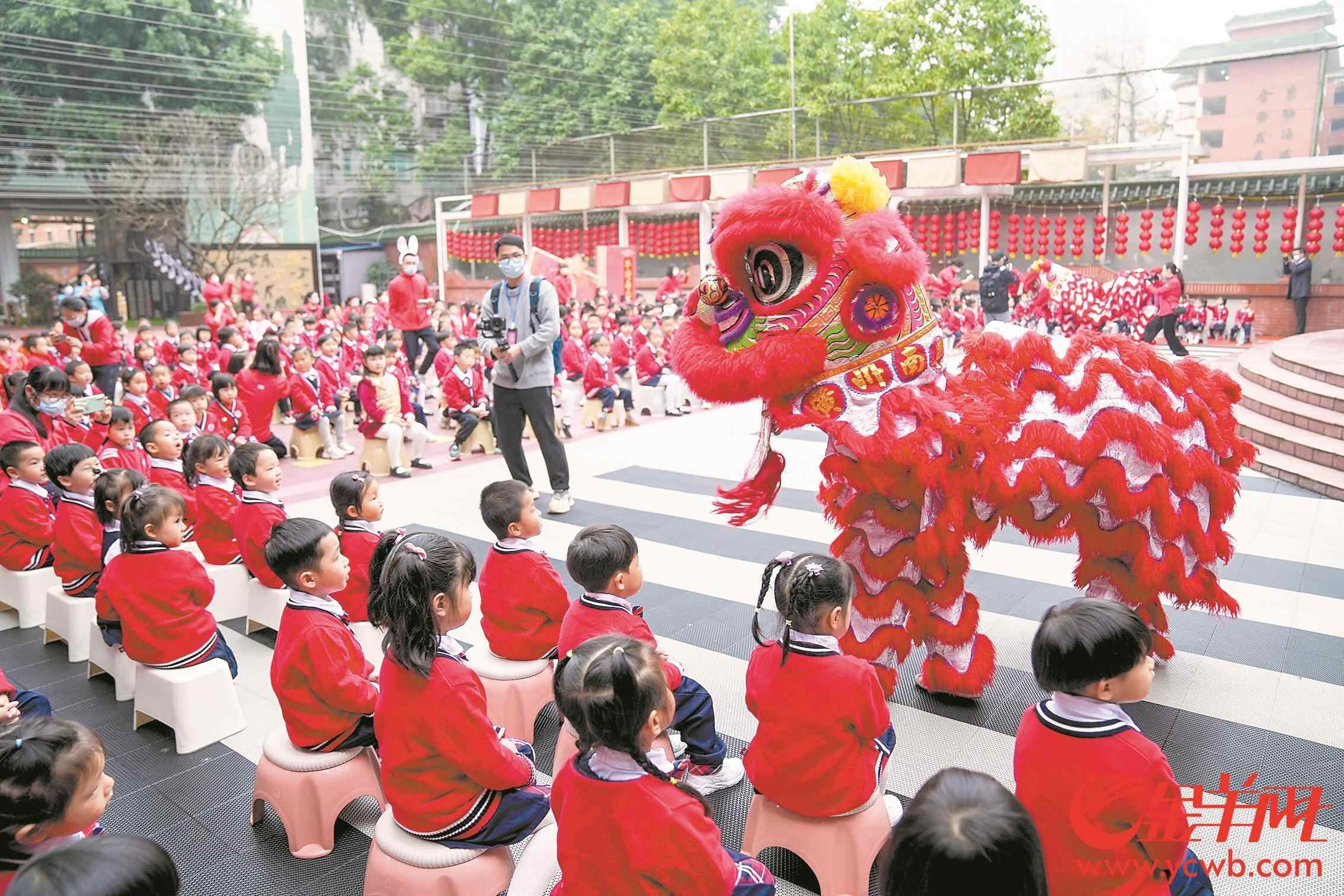 广府庙会“搬”进校园。2月6日,在广州市越秀区珠光路小学的开学典礼上,学校邀请了广府民间舞狮传承人现场展示舞狮,与学生面对面介绍舞狮文化,手把手指导舞狮技法。狮子的闪转腾挪间,将新春的福气带到学校、送给师生。
