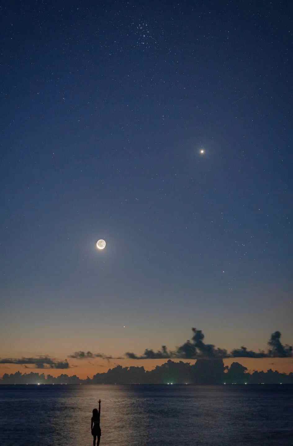 各大行星和月亮之间,有时彼此靠近甚至遮挡,会组成更有意思的一些天象。如金木双星伴月、金火双星伴月、月掩金星等。