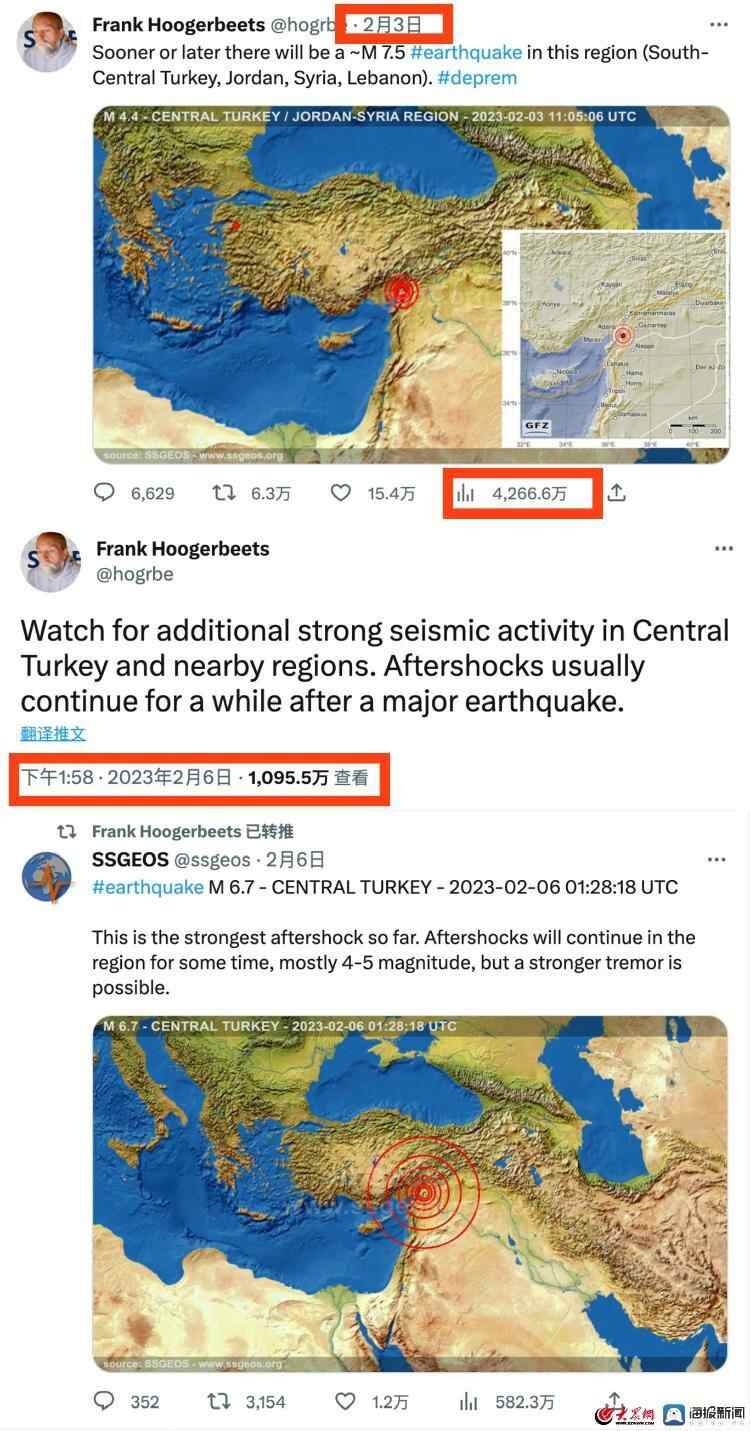 这位名为弗兰克·胡格比茨(FrankHoogerbeets)的“地震专家”在2月3日发布的帖文中预警称,土耳其中南部将要发生7.5级大地震。记者注意到,截至北京时间2月7日13时,这篇帖文的浏览量已达到4266万。