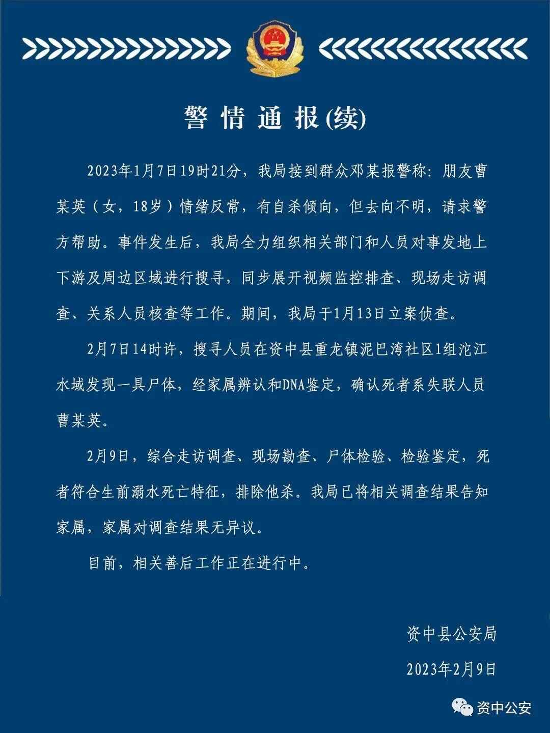 2月9日,四川省内江市资中县公安局发布警情通报,资中18岁女生遗体在江中被发现,符合生前溺水死亡特征,排除他杀。
