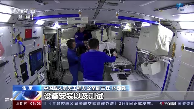 中国载人航天工程办公室副主任 林西强:随着中国空间站的全面建成,目前我们转入应用与发展阶段,神舟十五号乘组两个月来完成了梦天实验舱所有机柜的解锁、设备安装以及测试,目前已经陆续在开展实验工作,另外神舟十五号乘组也完成了我们首次货物气闸出舱,为我们后续任务的开展奠定了良好基础。