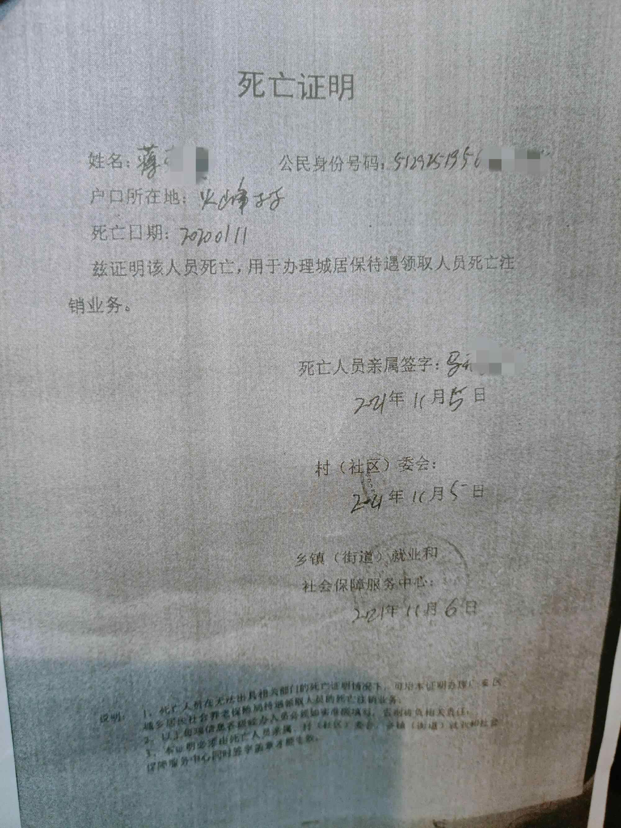 今年67岁的老蒋,是四川广安市广安区井河镇人。2月9日,老蒋向记者提供了他从广安区城乡居民社会养老保险局(以下简称“社保局”)拿到的“死亡证明”复印件。这份“死亡证明”显示,老蒋于2020年1月11日“去世”,开具日期为2021年11月5日,亲属签字一栏为“马某某”。