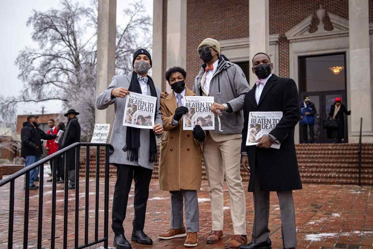 2月1日,在美国田纳西州孟菲斯市,参加泰尔·尼科尔斯追悼会的人们展示报纸上尼科尔斯的照片。图源:新华社