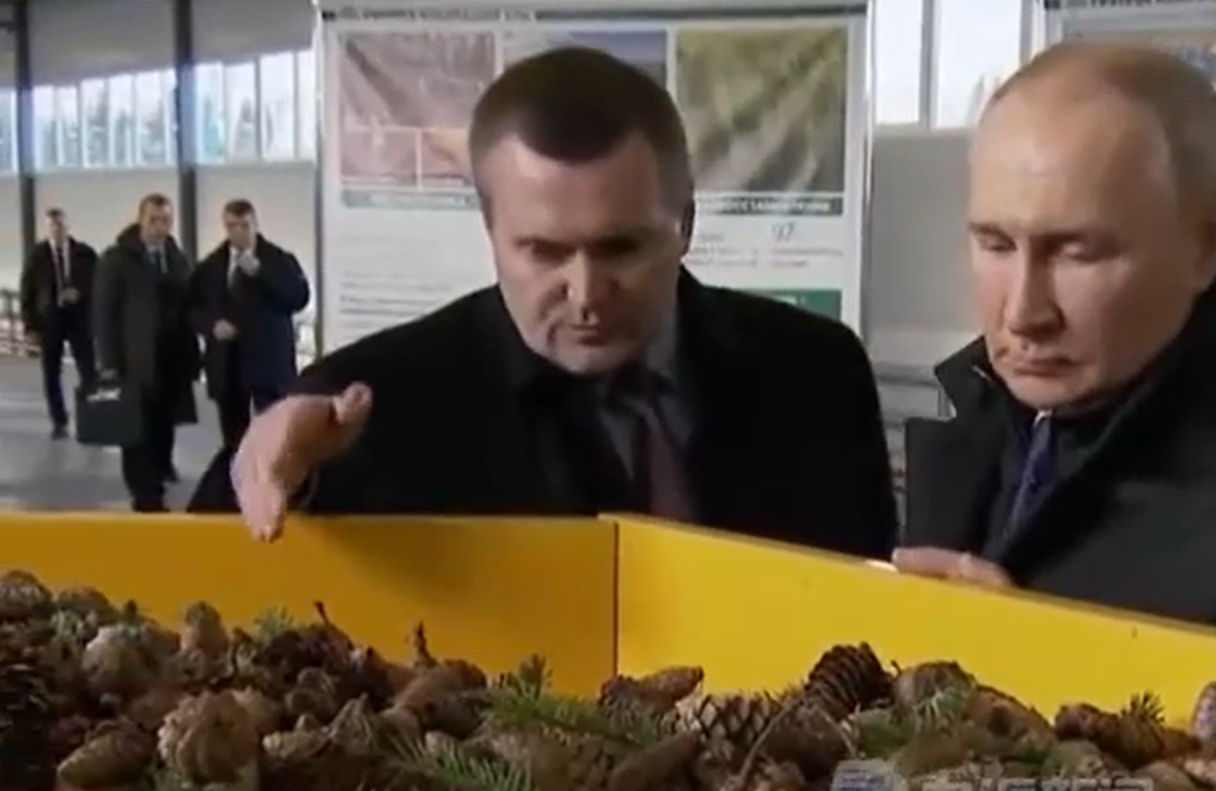 2月10日,在俄罗斯阿尔汉格尔斯克州,俄罗斯总统普京参观木材工业工厂,保镖提着黑色手提包站在身后。