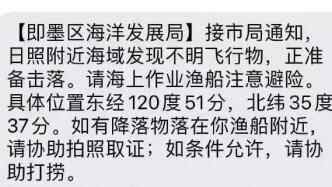 2月12日,山东青岛即墨区海洋发展局回应“日照附近海域发现不明飞行物,正准备击落”:确有此事,不明飞行物具体是什么尚未接到通知,已短信通知附近渔民注意安全。