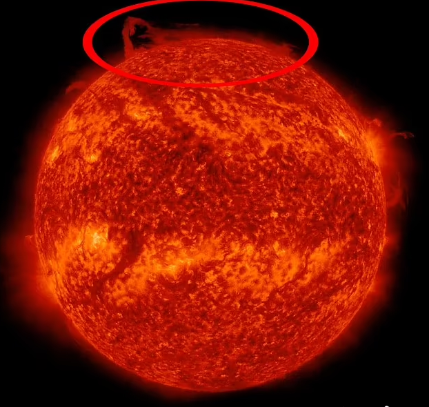 NASA表示,这是一个巨大的等离子体丝,或电化气体,看起来就像从太阳表面射出的细长的、不均匀的线,被太阳的磁力拴住。