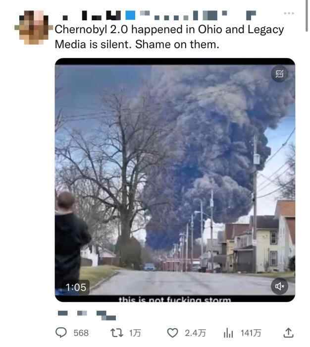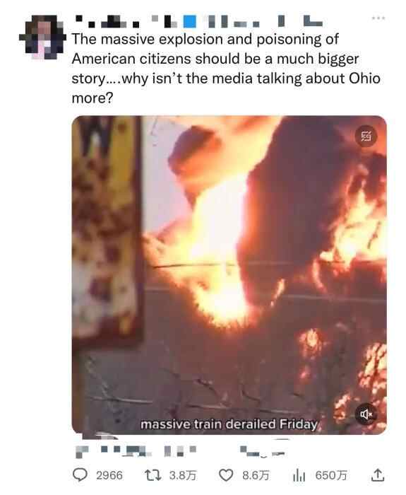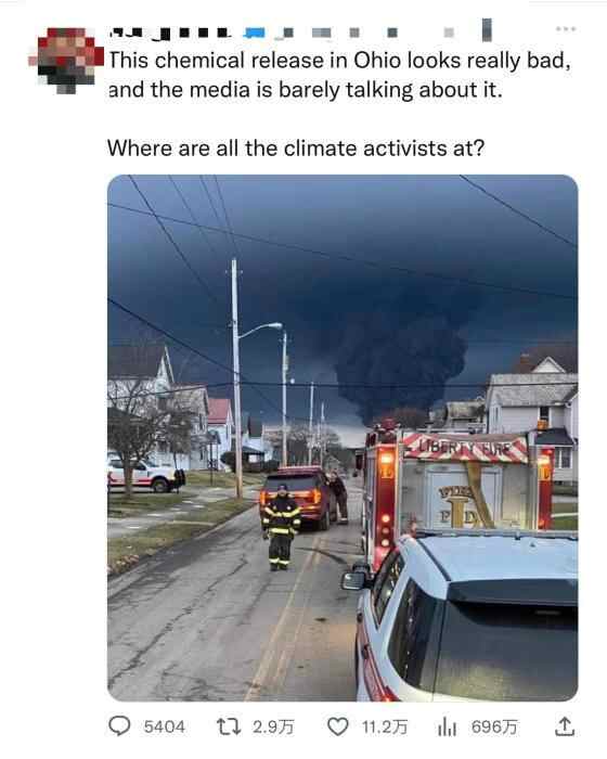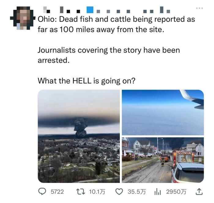 “俄亥俄州巨大的爆炸和化学物质泄漏危及美国居民生命安全,理应是更重大的故事……为什么媒体不对这一事件多加报道?”