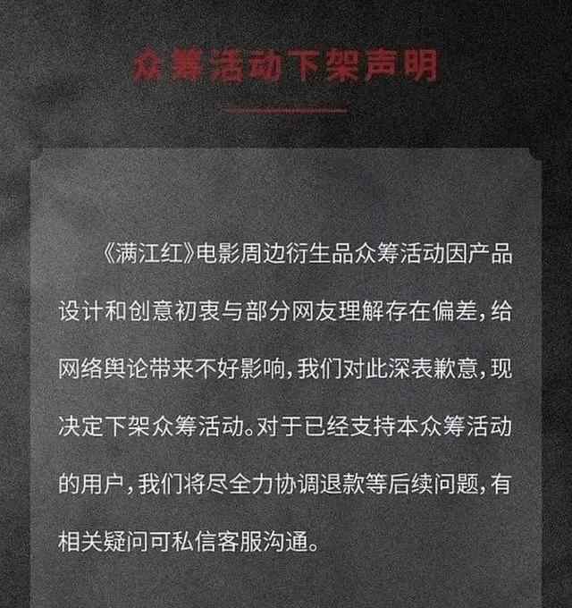 随后,官方发布声明表示:“《满江红》电影周边衍生品众筹活动因产品设计和创意初衷与部分网友理解存在偏差,给网络舆论带来不好影响,我们对此深表歉意,现决定下架众筹活动。对于已经支持本众筹活动的用户,我们将尽全力协调退款等后续问题,有相关疑问可私信客服沟通。”