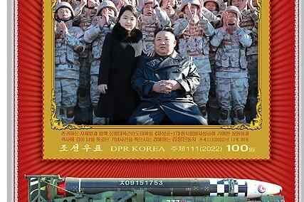 朝鲜邮票社将于2月17日发行一组新邮票,其中包含朝鲜最高领导人金正恩携女儿亲临武器试射场等画面。韩联社称,这将是金正恩的女儿首次登上朝鲜邮票。