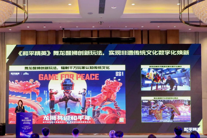 在城市文旅之外,《和平精英》也非常重视中国传统文化的数字化表达。 2022年春节,《和平精英》与国家级舞龙醒狮文化非遗传承人,在游戏中打造了一个极具中国特色的建筑——龙狮城,并推出龙狮载具、新年撞钟、抢头彩等玩法,实现了舞龙醒狮传统中国年俗文化在游戏场景中的数字化焕新。