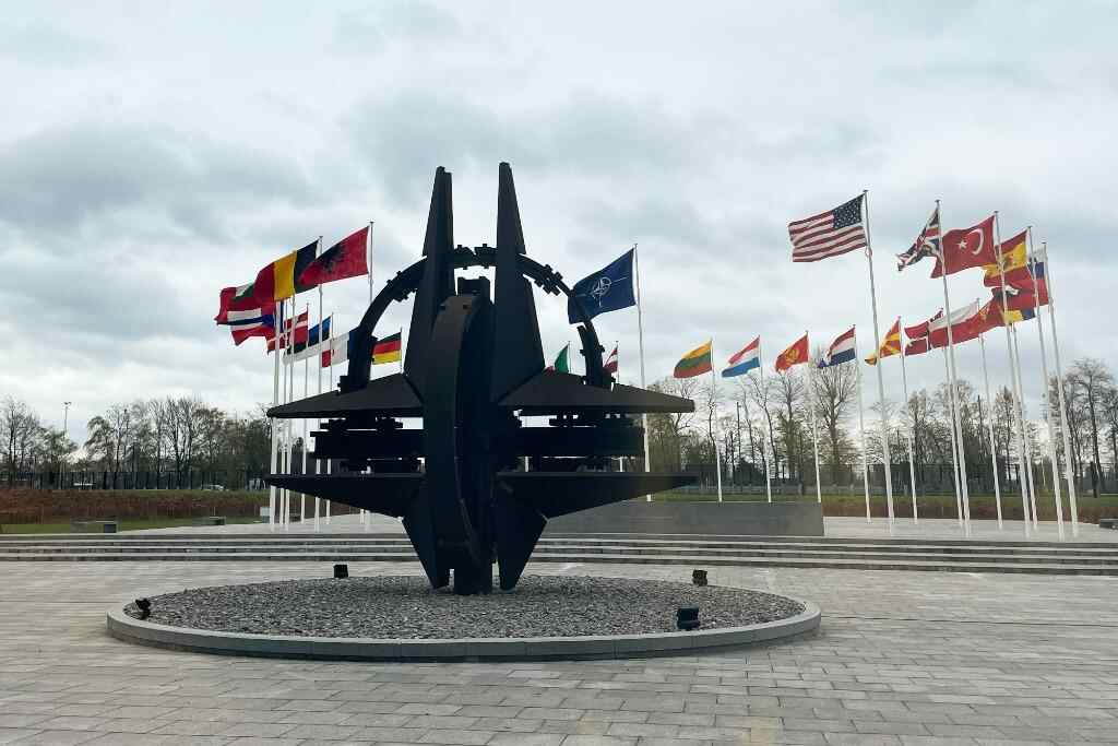 这是2022年4月6日在比利时布鲁塞尔拍摄的北约总部的雕塑与旗帜。新华社记者郑焕松摄