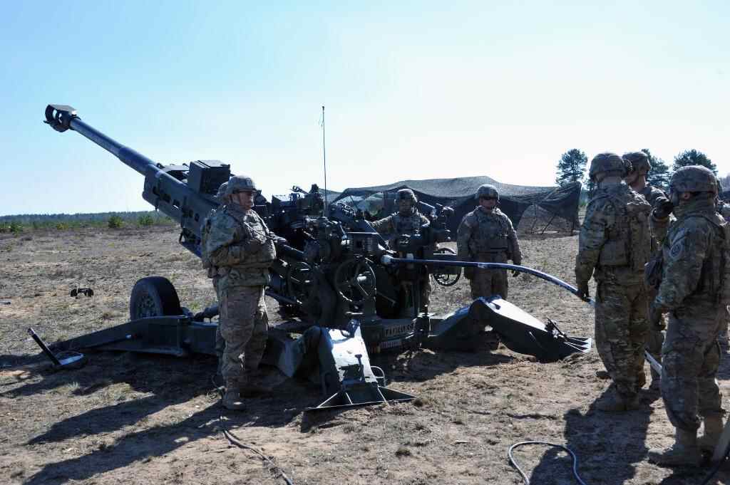 2016年4月28日,在拉脱维亚阿达日军事基地训练场,美军炮兵进行射击准备。新华社记者郭群摄