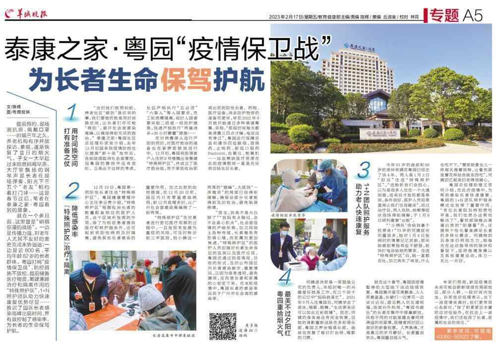“当时我们就预判到,养老社区‘破防’是迟早的事,我们要做的就是用时间换空间,让长者们尽可能‘晚阳’,避开社会面感染高峰,以确保得到充足的救治。” 泰康之家•粤园社区总经理孙家俊介绍,去年12月初国务院疫情防控优化措施“新十条”发布后,各地陆续取消社会面管控,但粤园的管控并没有放松。正是出于这样的考虑,社区严格执行“五必须”“六禁入”等入园要求,员工轮岗需隔离,临时入园者要采取二级或一级防护措施,快递严格执行“两遍消杀+26小时静置”措施……