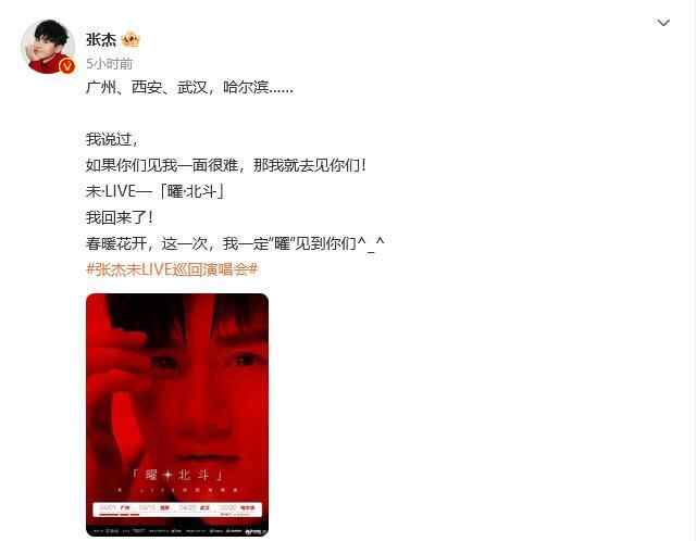 17日,歌手张杰也在微博官宣巡回演唱会的消息,他写道:“如果你们见我一面很难,那我就去见你们!”海报上,除了已经公布的4个城市外,还有一行小字“更多城市,coming soon……”,预示着接下来还会有更多的见面机会。