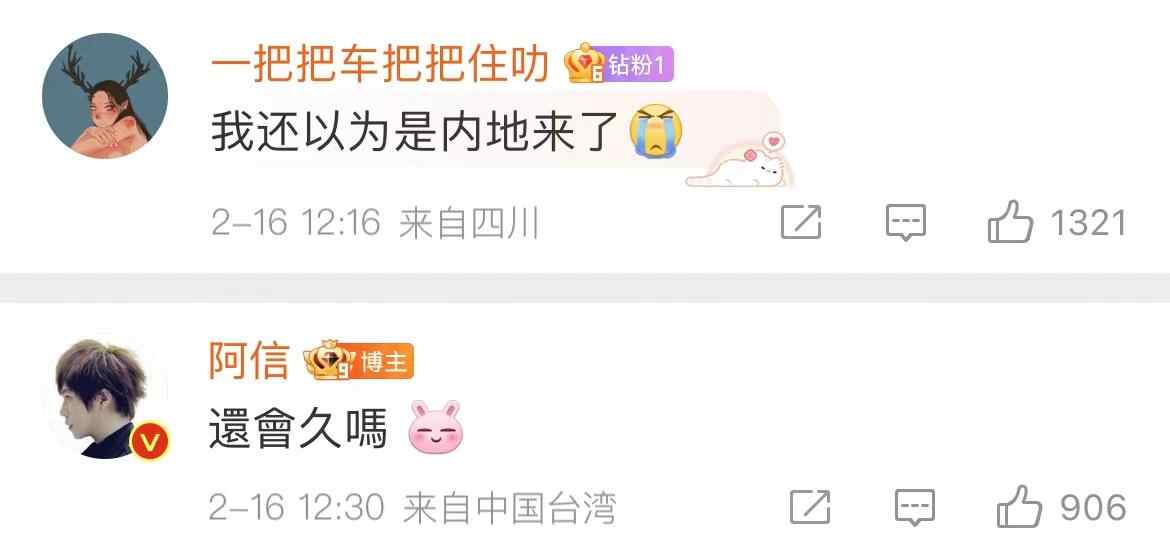 有歌迷在评论里遗憾称,以为是内地场演唱会的消息来了,而阿信一句“还会久吗”的回复立刻点燃了粉丝们的热情,大家纷纷报上坐标,期盼演唱会的到来。