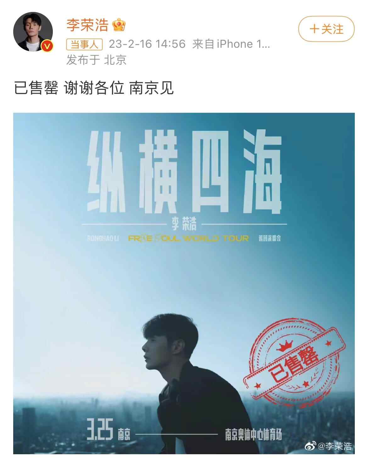 16日下午14时,歌手李荣浩“纵横四海”巡回演唱会首站南京站正式开启预售,14时56分,李荣浩发布微博宣布演唱会票已售罄。在这条微博下面,一部分抢到票的网友们晒出票来,分享喜悦之情,其他人则追问着接下来还会去到哪些城市。