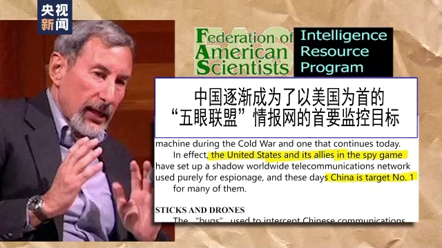 美国科学家联合会网站的媒体报道存档文章显示,专攻美国情报学研究的学者里切尔森·杰弗里在1999年6月接受美国全国广播公司采访时表示,中国逐渐成了以美国为首的“五眼联盟”情报网的首要监控目标,对中国的监控手段从海底的潜艇、陆地上的天线系统乃至太空的卫星,无孔不入。