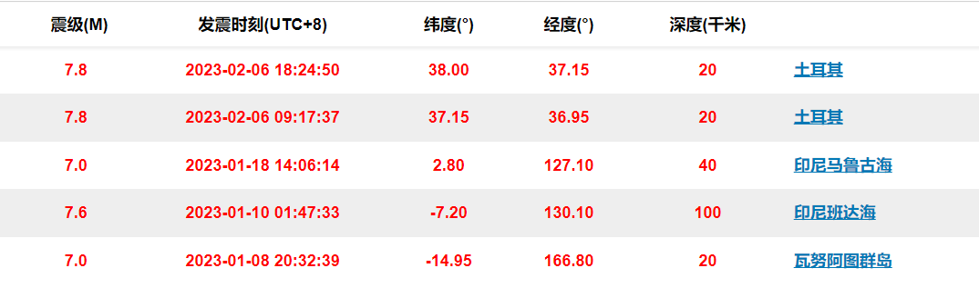 根据中国地震台网数据,2022年全球7级以上地震有7次。