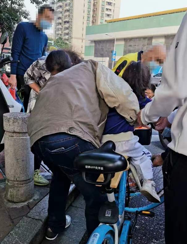 目击者李小姐称,自己在回翠城花园路上看见了惊险的一幕:一位老大爷用共享单车搭载小女孩,途中小女孩的左脚伸进前车轮被卡住,疼得一直在哭闹。幸得热心路人鼎力相助,孩子的脚才顺利从车轮中取出。