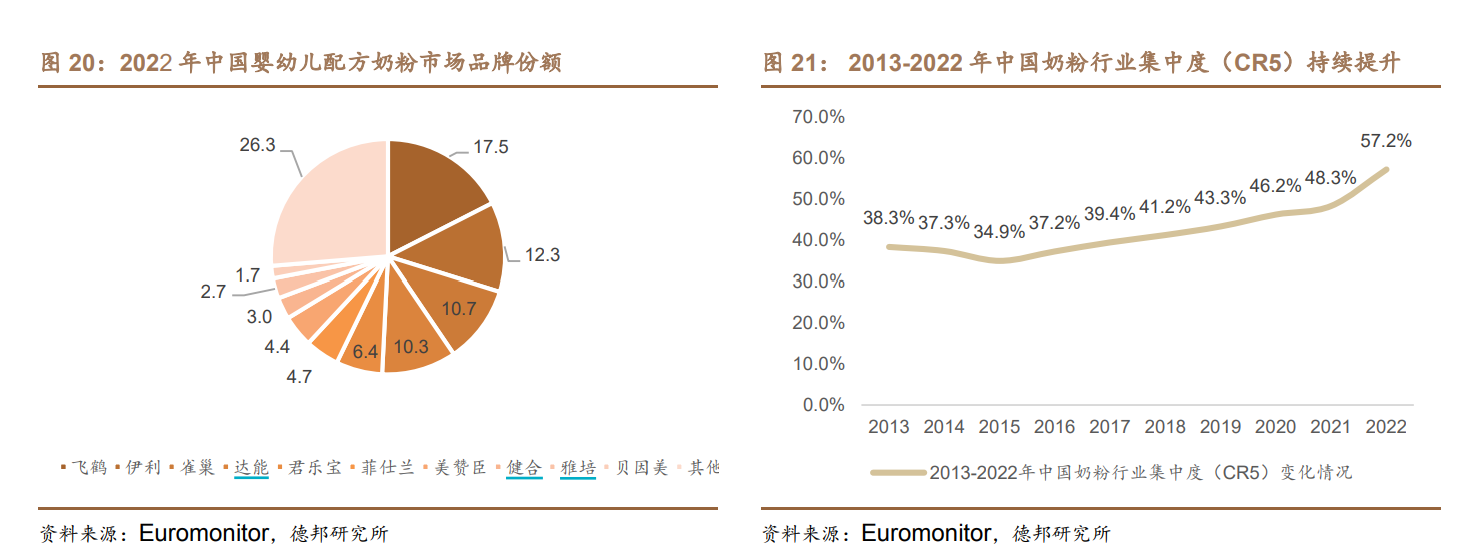 国泰君安2022年12月19日发布的研报指出,新国标落地,预计约20%的中小品牌市场份额将进一步向前十家奶粉企业集中,在“十强”内部,也会出现市场份额向头部3至5家奶粉企业集中的趋势,国内奶粉行业前三家奶粉企业合计占有的市场份额有望从2021年的40%提升至长期的60%至70%。