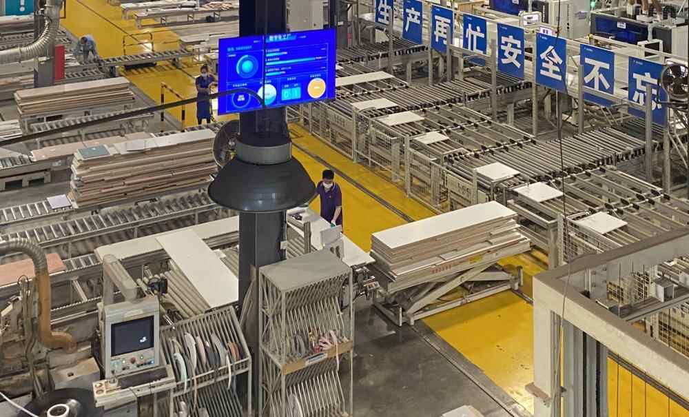 在维尚家具偌大的数字化生产车间内,只有几位员工守在设备旁,剩下就是“隆隆”的机器运转声,切割、封边、喷涂、装配等每道工序有条不紊进行,一块块板材整齐有序地排列在传送带上。