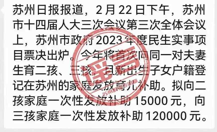 今天(2月22日),网络上流传着一张关于“苏州拟向二孩、三孩家庭一次性发放补助”的“苏州日报报道”的图片,此为谣言。苏州日报社保留追究造谣者法律责任的权利。
