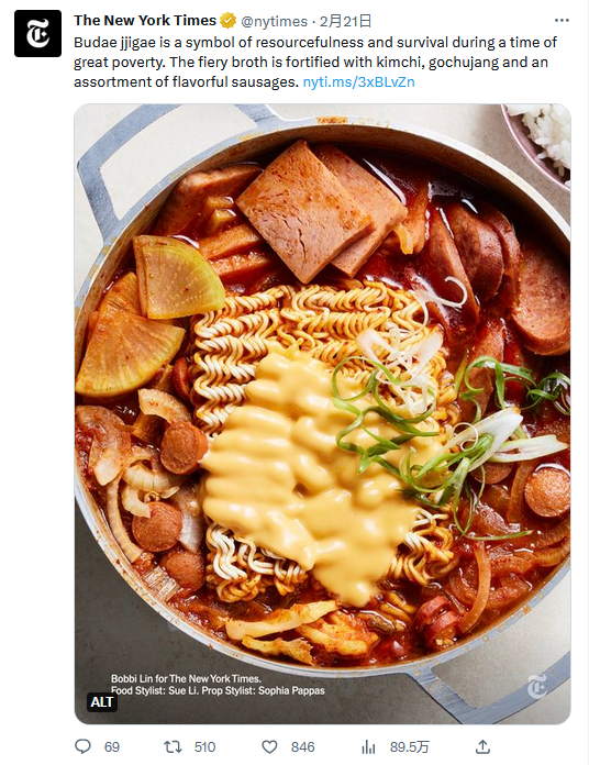 美媒《纽约时报》在推特发布由韩裔美国人撰写的“韩式部队锅”食谱,介绍称这道菜起源于朝鲜战争,最早用“美国陆军剩余的口粮”制成,将泡菜、韩式辣酱、午餐肉、香肠“大乱炖”后,再铺上一层美式奶酪,最后搭配白米饭食用。