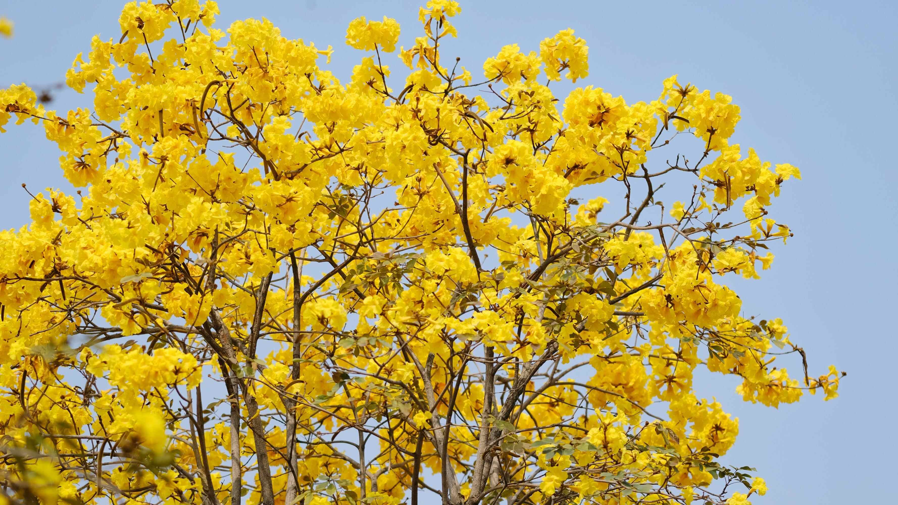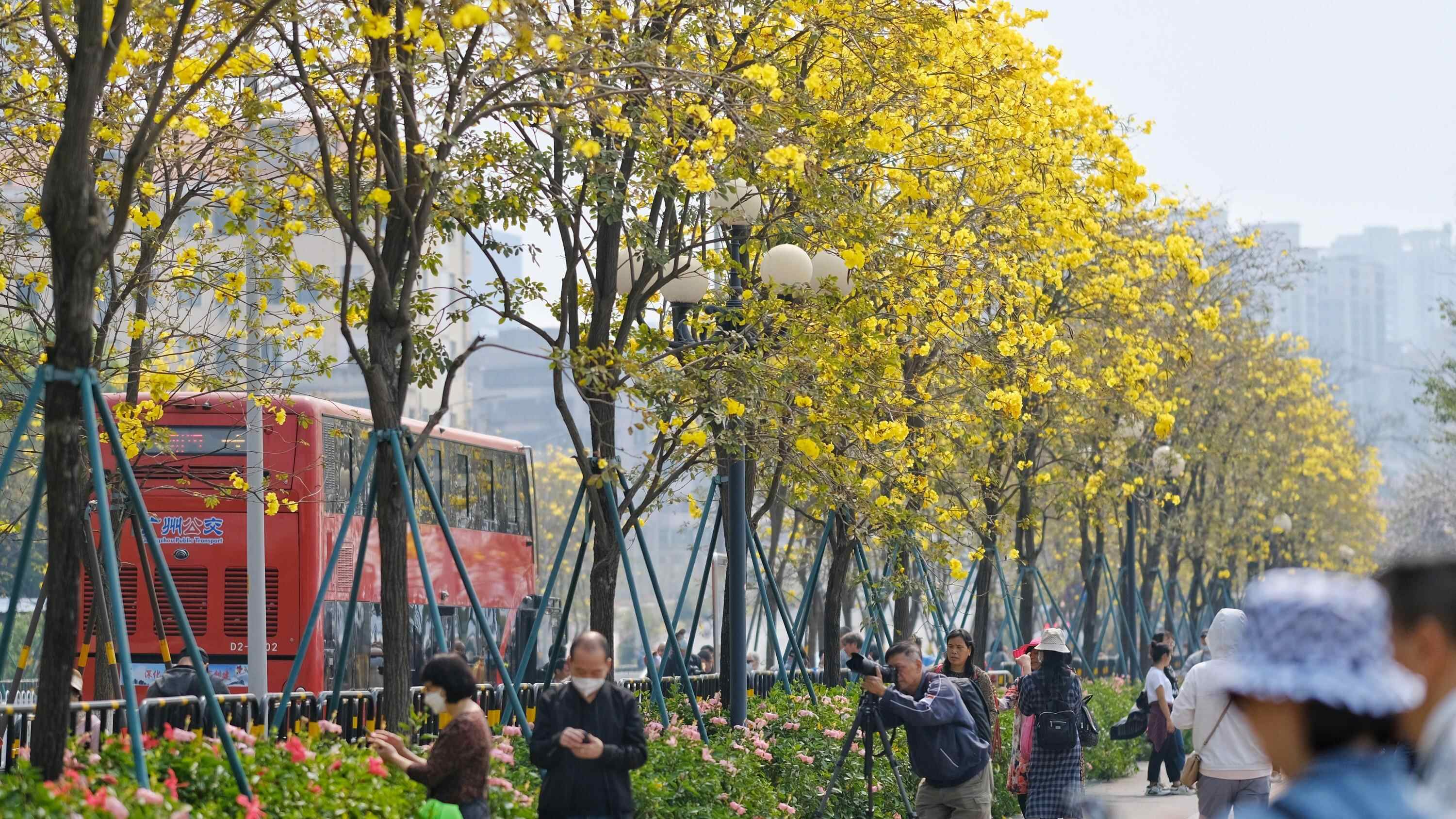 虽然干燥天气有些难以适应,但晴天的美景总能给人带来好心情。春光明媚,广东各地花满枝头,广州海珠区洲头咀公园的黄花风铃木也盛情绽放,一眼望去金灿灿的,美不胜收,吸引许多市民“打卡”。