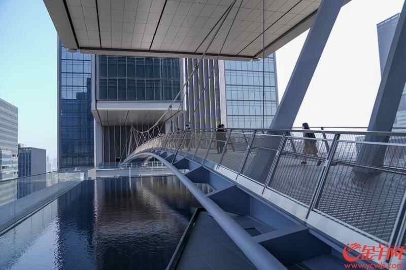 在24层、离地面105米的高空,一座轻盈的户外钢悬索桥连接着东西塔。站在桥上眺望湖光山色,风景这边独好。高楼大厦拔地而起,宛如“科创森林”。
