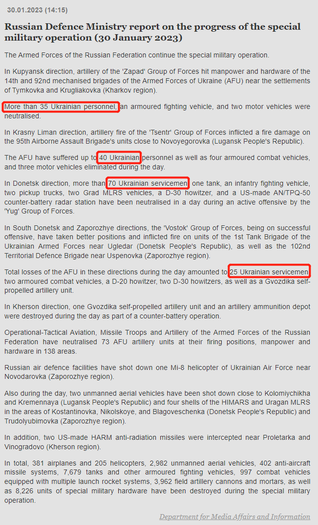 今年2月,据塔斯社报道,绍伊古在俄国防部的一次内部会议上提到,乌军在今年1月至少损失了6500名军人。记者对1月中俄国防部每日简报中提到的各战役乌军损失人数进行了统计(其中1月15日的数据缺失),发现报告中提到的消灭乌军的约数为6915名,其中不包括报告单独提到的“200名雇佣兵”和55名“极端分子”。这一数据与绍伊古报告的数据基本相符。
