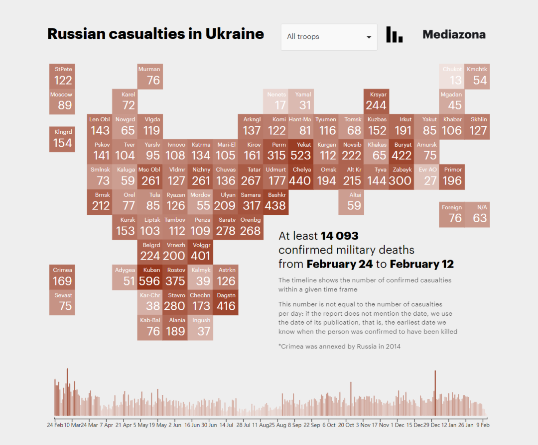 例如,BBC俄罗斯服务处和俄独立媒体Mediazona自战争伊始,便在合作调查统计俄军将士的具名死亡信息。截至2月12日,该项目证实,至少已有14093名俄罗斯将士的具名死亡报告得到确认,其中包括4名陆军上将,1名海军上校,52名陆军上校,2名海军中校,129名陆军中校和1名海军少校。