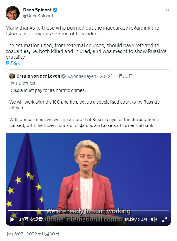 但这一数字显然不会得到乌政府的承认。去年11月30日,欧盟委员会主席冯德莱恩在一次公开讲话中疑似出现口误,称当时乌克兰已有100000将士和20000平民死亡。此话一出,引起乌方激烈反应。欧盟委员会发言人斯皮南特(Dana Spinant)在个人推特上迅速回应,称冯德莱恩提到的数字并不准确,该数字是从外部来源获得,旨在代表乌军的总伤亡人数。