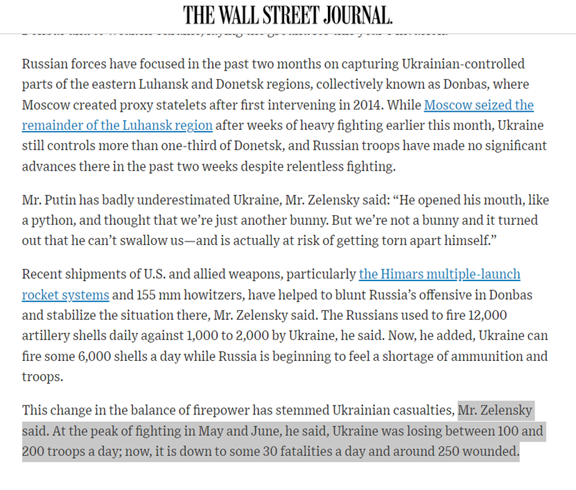 到了去年7月底,由于西方武器的供应,乌军的境遇有所好转。在接受《华尔街日报》的采访时,泽连斯基表示,乌克兰武装部队的日损失已减少到每天30人死亡和250人受伤左右。他同时提到,在5月和6月的战斗高峰期,乌克兰每天要损失100至200名士兵。