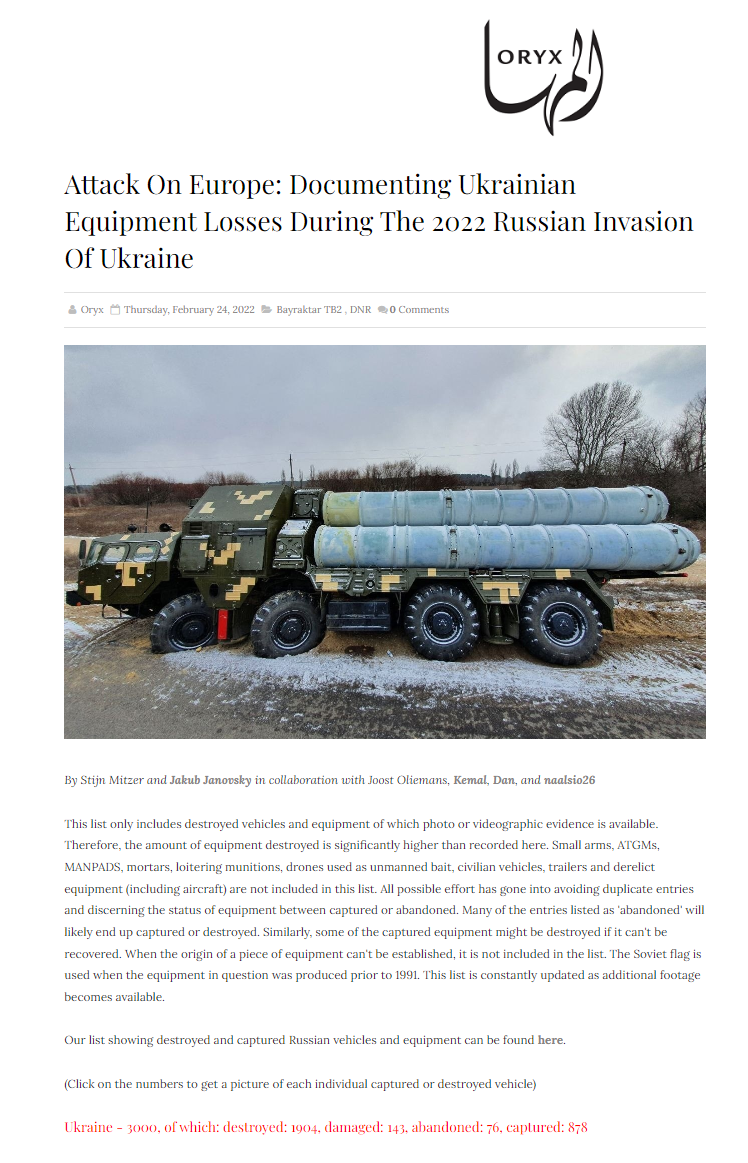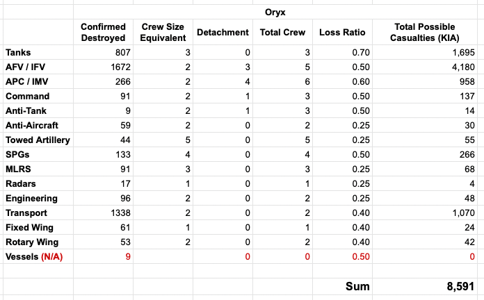 Oryx组织公布的乌军的武器损失总数在3000件左右,其中1904件被毁,包括278辆坦克,178辆装甲战车,346辆步兵战车,123辆装甲运兵车等。使用@osint_east的估值计算,这些装备损失对应的乌军阵亡数在3630人左右。但鉴于Oryx只收集武器装备的视觉资料,且有网友指出Oryx总体上可能具有亲乌克兰的立场。因此,乌军的实际装备损失可能要远大于Oryx所列数据。