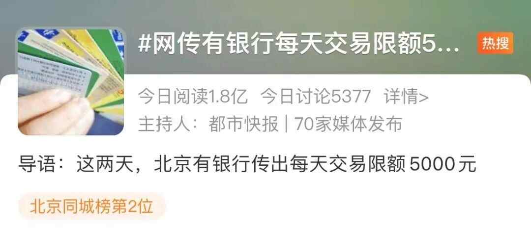 2月24日,“网传有银行每天交易限额5000元”的话题登上热搜,话题内容提到,近日有北京地区银行机构传出,对Ⅰ类账户设置了交易限额,非柜面所有渠道的交易额度,每天上限为5000元。